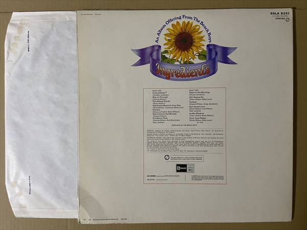ピースフルな温もりに満ちたハーモニーポップの「Add Some Music To Your Day」! 彼らが設立したブラザー・レコードでのラスト・アルバム。試聴の他に、Dennis Wilsonの作曲が冴える美しいバラード「Forever」、『Smile』制作時のセッションをベースにした「Cool, Cool Water」なども収録。バンドとしての完成度が頂点に達し『Pet Sounds』以後の最高傑作に挙げる方も多い名作。USA盤には未収録の「Cottonfields」を追加収録したUK盤です!*MAT= SSLA 8251 A-1 / SSLA 8251 B-1。時折ごく軽いパチ・ノイズ。ジャケ縁付近に擦れ/皺。右下と裏左下に皺大。表裏コーティングの見開きジャケです。