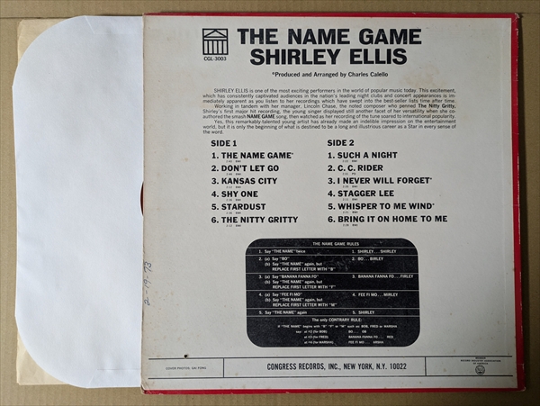 数え歌的なメロディーがキャッチーなファンキーR&Bの「Name Game」!Charlie Calelloがプロデュースしたカリブ系の血を引くボーカリストによるセカンドLP。同タイプのダンス・ナンバー「I Never Will Forget」や、ファースト・ヒットとなったパーティーチューン「The Nitty Gritty」なども収録。クボタタケシ氏もレコメンされていた人気作です!*「Kansas City」のアウトロにパチ・ノイズx4。ジャケ縁付近に擦れ/皺。右下にドリルホール。裏左端に書き込み。MONO盤です。