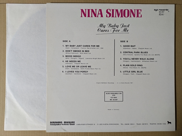 ゆるやかなスウィングが心地よいボーカルジャズ人気曲の「My Baby Just Cares For Me」!米国を代表する黒人女性ジャズ・シンガーによるデビュー作『Little Girl Blue』の再発盤。「カモナ・マイ・ハウス」を上品にしたようなアップテンポで洒落た「Love Me Or Leave Me」、Duke Ellingtonをカバーしたスウィング間抜群の「Mood Indigo」なども収録。シンプルなバッキングが味のあるボーカルを引き立てた名盤です!*時折軽いチリ/パチ・ノイズ。ジャケ縁付近に擦れ/皺有りです。