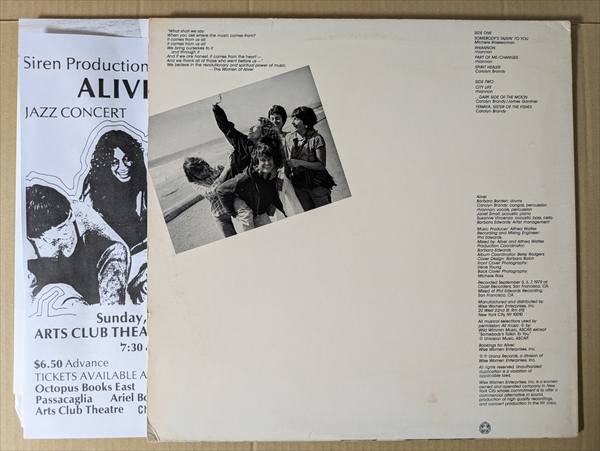 !緩急をつけた展開で盛り上げるスキャット入りフュージョンの「Somebody’s Talkin’ To You」! カリフォルニアの女性5人組によるファースト・アルバム。鮮やかにピアノが響くメロウな前半から躍動感あふれる4ビートへ展開、パーカッション・ソロでヒートアップしていくA1に、高速スキャトがパーカッシヴなピアノに乗るサンバ・テイストを取入れた「City Life」も収録しています*「Dark Side Of The Moon」の前半に時折軽いパチ・ノイズ。ジャケ縁付近に擦れ/皺。歌詞カードと、ライヴ・フライヤーのコピー付きです。