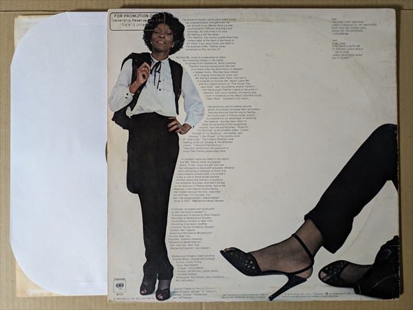 Sam Dees作の爽快フィリー系ダンサーな「I Want What You Want」! ゴスペル出身の女性シンガーによるファースト・アルバム。同じくSam Deesが提供したバラードの2曲や、Grey & Hanks「How Long」、バウンシーなディスコのSmokey Robinson & The Miracles「I Second That Emotion」、軽やかなパーカスやメロウなストリングスが心地よいLeon Ware「I Can Dream」など、聴きどころ満載です!*盤擦れ多。ジャケ縁付近に擦れ/皺。下部にプロモシール大。白ラベルのプロモ盤です。