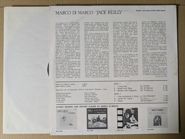 互いの息遣いを確かめ合うエレガントなピアノ・ジャズの「Dopo」!イタリアの人気ジャズピアニスト、マルコ・ヂ・マルコとアメリカ人ピアニストのJack Reillyによるデュオ録音。 繊細さと力強さを併せ持った名演「Bossa With Regards」など、互いの見せ場を知り尽くした息の合ったプレイで引き込んでいくライヴ・アルバム。レアなオリジナル盤です!*所々軽いチリパチ・ノイズ。ジャケ縁付近に擦れ/皺。裏右端にシミ。右下に擦れ/剥がれ有りです。