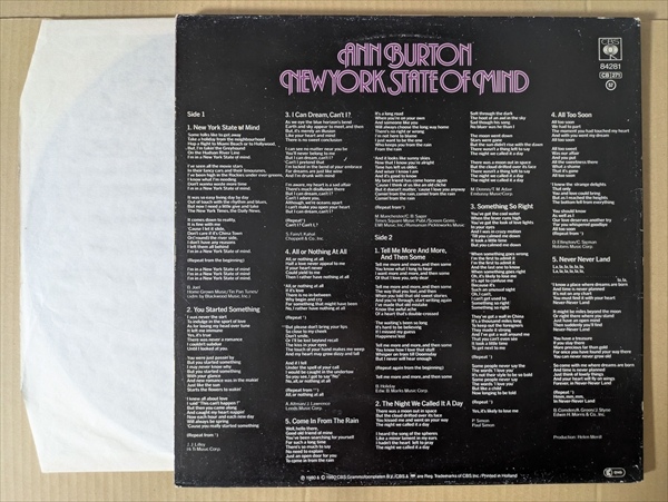 Billy Joelをカバーしたスモーキーなジャズボーカルの「New York State Of Mind」! オランダ最高の女性シンガーによるNY録音。Helen Merrillがプロデュース、Michael Renzi (p)、Buster Williams (b)、Grady Tate (ds)のピアノ・トリオがサポート。Billy Joelの名曲をスローにカバーした、その場の雰囲気が伝わって来るようなリラックスしたボーカルと演奏が楽しめます。*音の薄い部分で時おり軽いチリパチ・ノイズ。ジャケ縁付近に擦れ/皺。見開きジャケです。