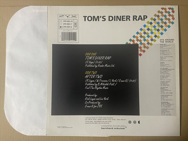 Suzanne Vegaの大ヒット曲「Tom’s Diner」にRAPを乗せた反則カバー!2枚のシングルを残したドイツのダンス・ユニットによるデビュー曲。B面にはマシーナリー・ビートに時おり女性の喘ぎ声が乗るダンス・トラックの「After Two」を収録。USAでは未発売のレコードです![45RPM 2track 12Inch]*音の薄い部分で軽いチリパチ・ノイズ。ジャケ縁付近に擦れ/皺有りです。