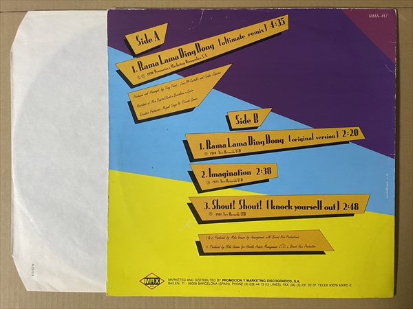 ドゥワップ・ネオロカ大人気曲のレア・リミックス!UKのドゥワップ系ロカ・グループによるベスト盤的内容の12inch。B面には「Rama Lama Ding Dong」「Imagination」「Shout! Shout! (2.48)」のオリジナル・ヴァージョンを収録。ライヴ仕立てのイントロから打ち込みドラムでリズムを強化したA面はスペインのみのレア・ヴァージョンです![2version 12inch]*「Imagination」の頭に軽いパチ・ノイズx4。ジャケ縁付近に擦れ/皺有りです。