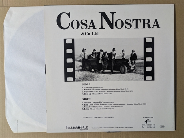 妖し気なキャバレージャズ風ポストパンクの「Cosa Nostra」! イタリア系犯罪秘密結社をバンド名にした7人組によるファースト・アルバム。往年のギャング映画を想わせるオールドタイミーでスモーキーなジャズの「Cosa Nostra」や、Lalo Schifrin「Mission Impossible」をエレクトリカルにアレンジした「Mission Impossible」なども収録。キャバレージャズの要素を取入れたポストパンク・ファンクです!*音の薄い部分に時おり軽いチリ/パチ・ノイズ。ジャケ縁付近に擦れ/皺。下縁に5cmの割れ/補修有りです。