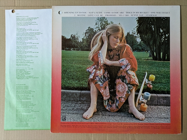 鮮やかなアコギと切ないメロディーが素晴らしいメランコリック・メロウの「Opening Up To You」!サバービアでも紹介された西海岸の女性SSWによるファースト・アルバム。ナチュラルで少し切な気なボーカルとアコギの音色を、Seawindのホーン・セクション、Jeff Porcaro、Chuck Raineyといったバックが支えた作品。アルバム・トータルでもクオリティの高い名盤です!*盤擦れ多。音の薄い部分に軽いチリチリ・ノイズ。稀に軽いパチ・ノイズ。ジャケ縁付近に擦れ/皺/日焼け。右上にパンチ穴。歌詞が印刷されたインナースリーヴ付きです。