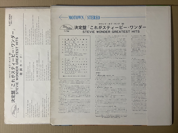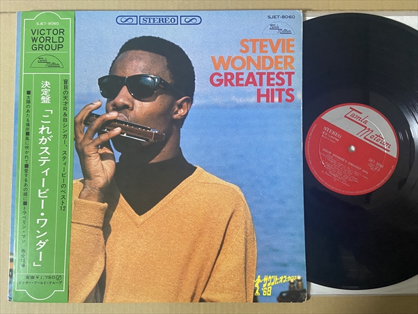 決定盤「これがスティーヴィー・ワンダー」! 「I’m Wondering」「Travelin’ Man」「Nothing’s Too Good For My Baby」「Fingertips Part 2」「Contract On Love」といったオリジナルLP未収録曲を含む初期ベスト。独自のジャケ・デザインでリリースされた日本盤です!*B面にスリーヴ跡。音の薄い部分で極軽いチリチリ・ノイズ。ジャケ縁付近に擦れ/皺。左縁に6cmの割れ。歌詞カードに3cmの破れ。帯付きです。