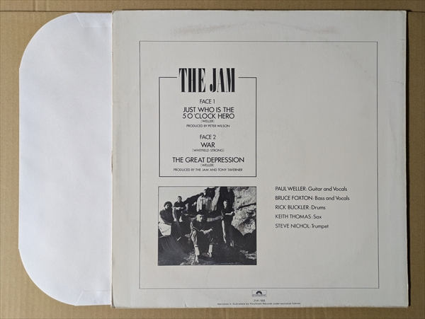 ホーンとクラップが効いたサビがキャッチーなポップチューンの「The Great Depression」!Paul Weller率いるJamの後期シングル。A面は70年代前期のKinksに通じる英国らしいメロディーのパワフルなポップ・.ナンバー。B面にはEdwin Starrのファンク・カバー「War」と、オリジナルLP未収の「The Great Depression」を収録しています![45RPM 3track 12inch]*「War」のアウトロに極軽いチリパチ・ノイズ。ジャケ縁付近に擦れ/皺。上端にヨレ/破れ小。左下にシール跡変色有りです。