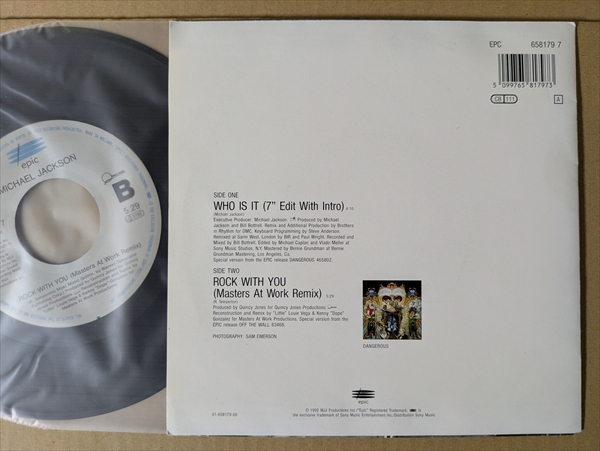 ダンクラ名曲「Rock With You」のクラブ・ミックス!アルバム『Dangerous』からのシングル・カット。A面は雰囲気に満ちた哀愁R&B。B面には「Rock With You」のMasters At Workによるリミックスを収録。ジャケ付きでリリースされたヨーロッパ盤です![2track 7inch]*音の薄い部分に軽いチリパチノイジャケ縁付近に擦れ/皺。厚みのある固めのジャケです。AB面の頭にチリパチ・ノイズ。